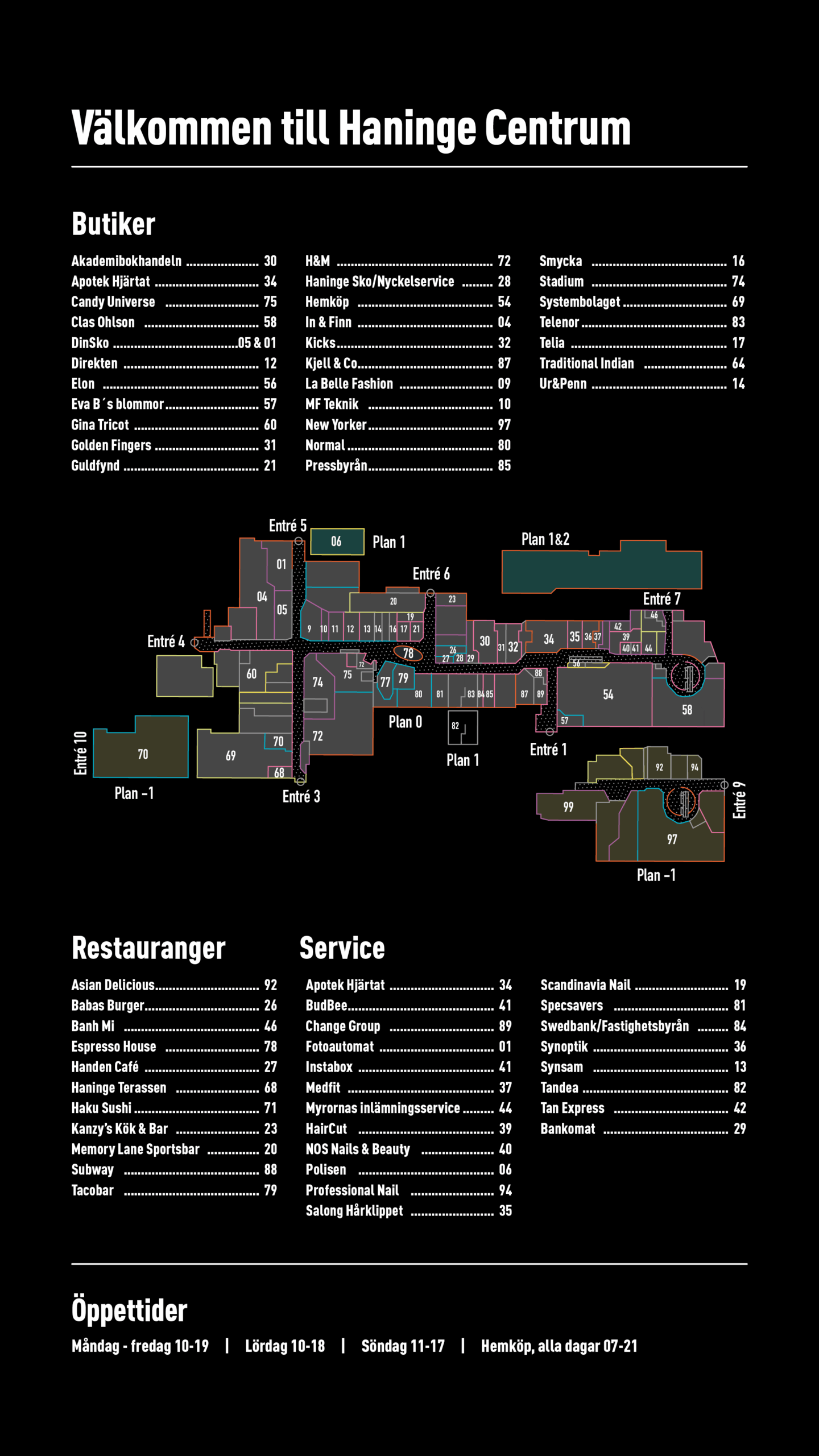 I Haninge Centrum kan du besöka över 60 butiker, restauranger och serviceverksamheter. Letar du efter någon specifik butik klicka dig då vidare till den butikens undersida här på webben. Väl på plats har vi stora tydliga hänvisningsskyltar som enkelt navigerar dig rätt.